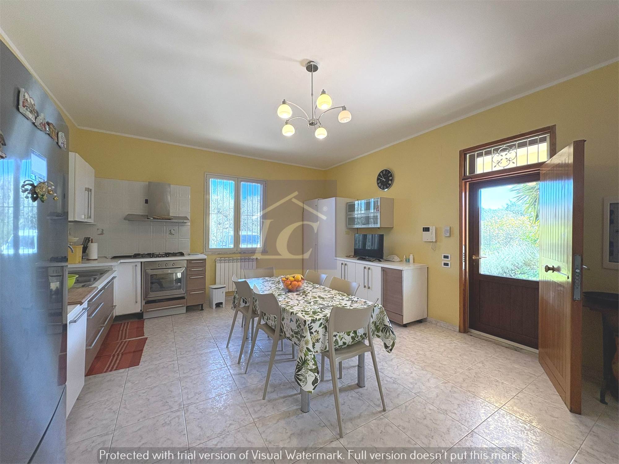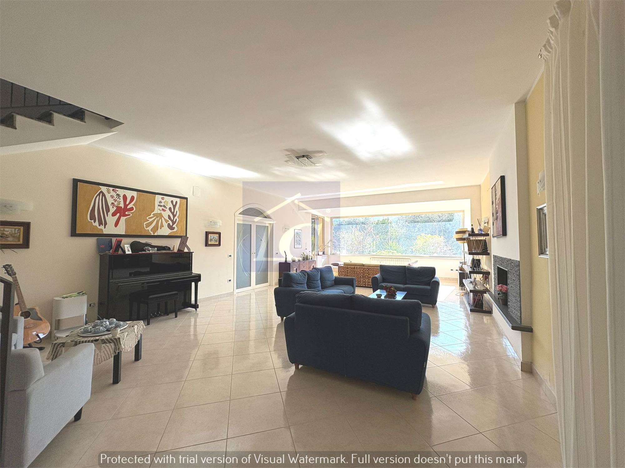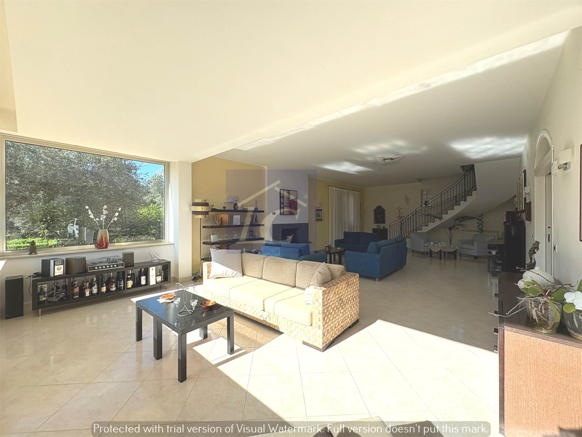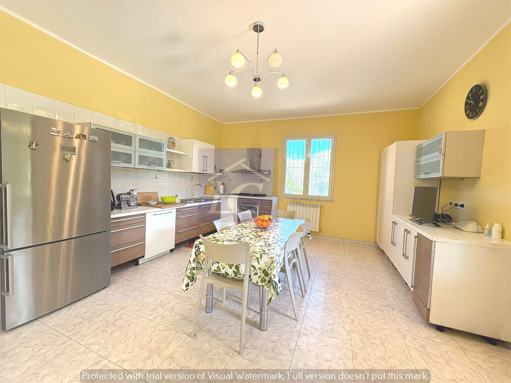 Ground floor: entrance from a masonry portico onto the kitchen-living room via a finished wooden and frosted glass door leads to a large hall of approximately 80 m2 with a 35 KW fireplace connected to the heating system that can function as a replacement for the boilers, laundry room, bathroom with shower cubicle, study.
