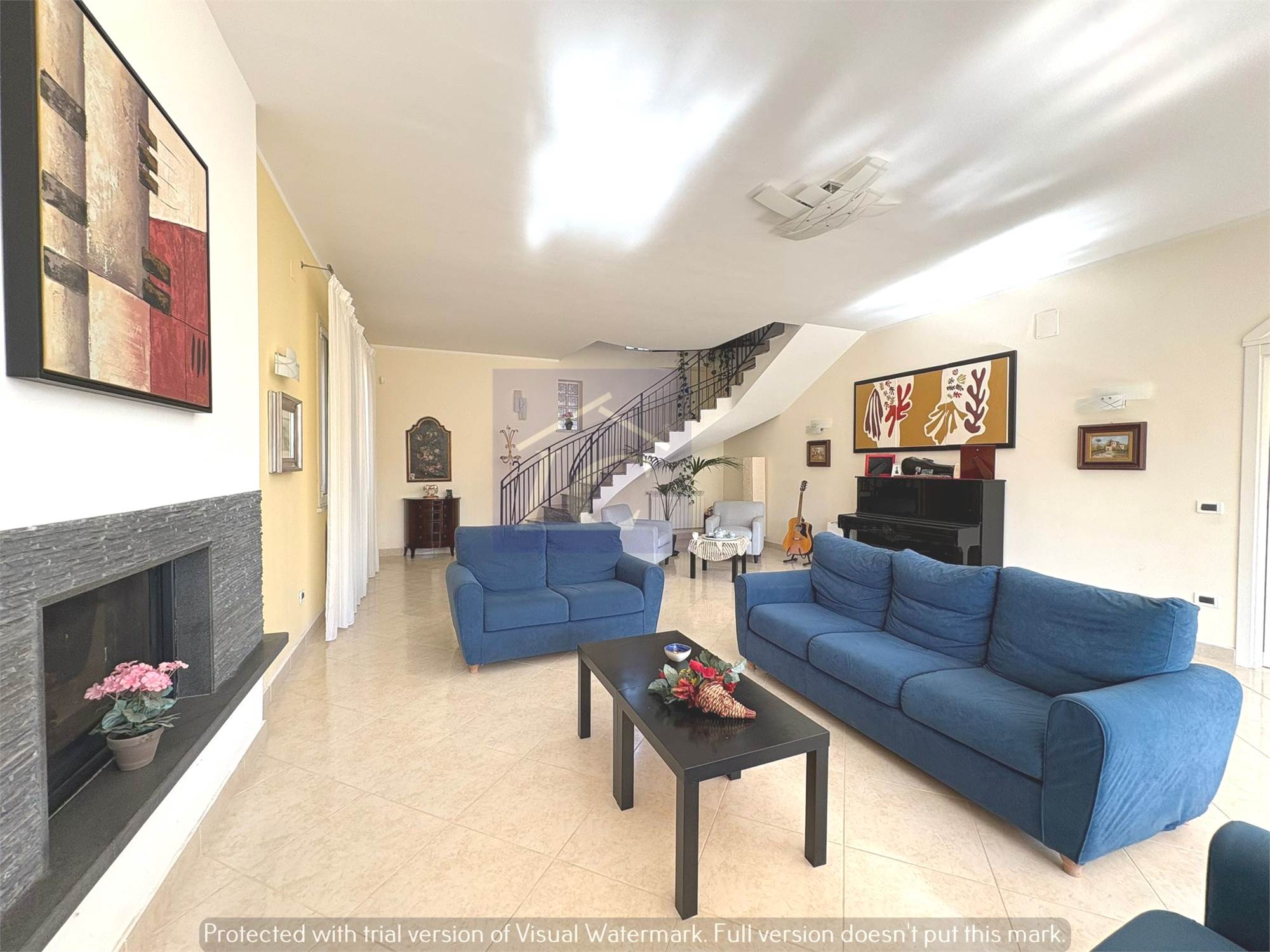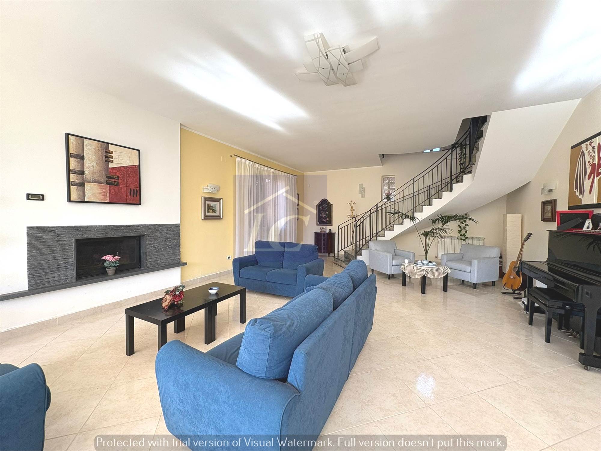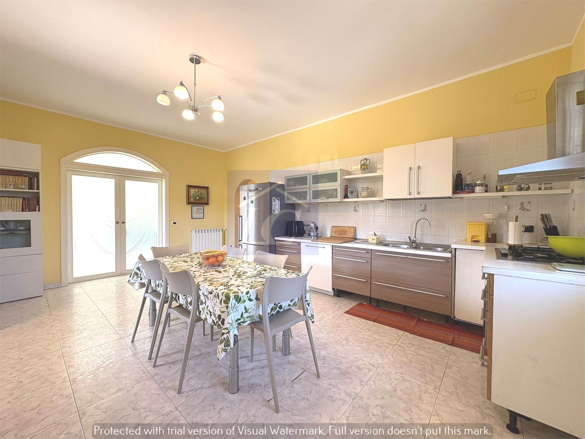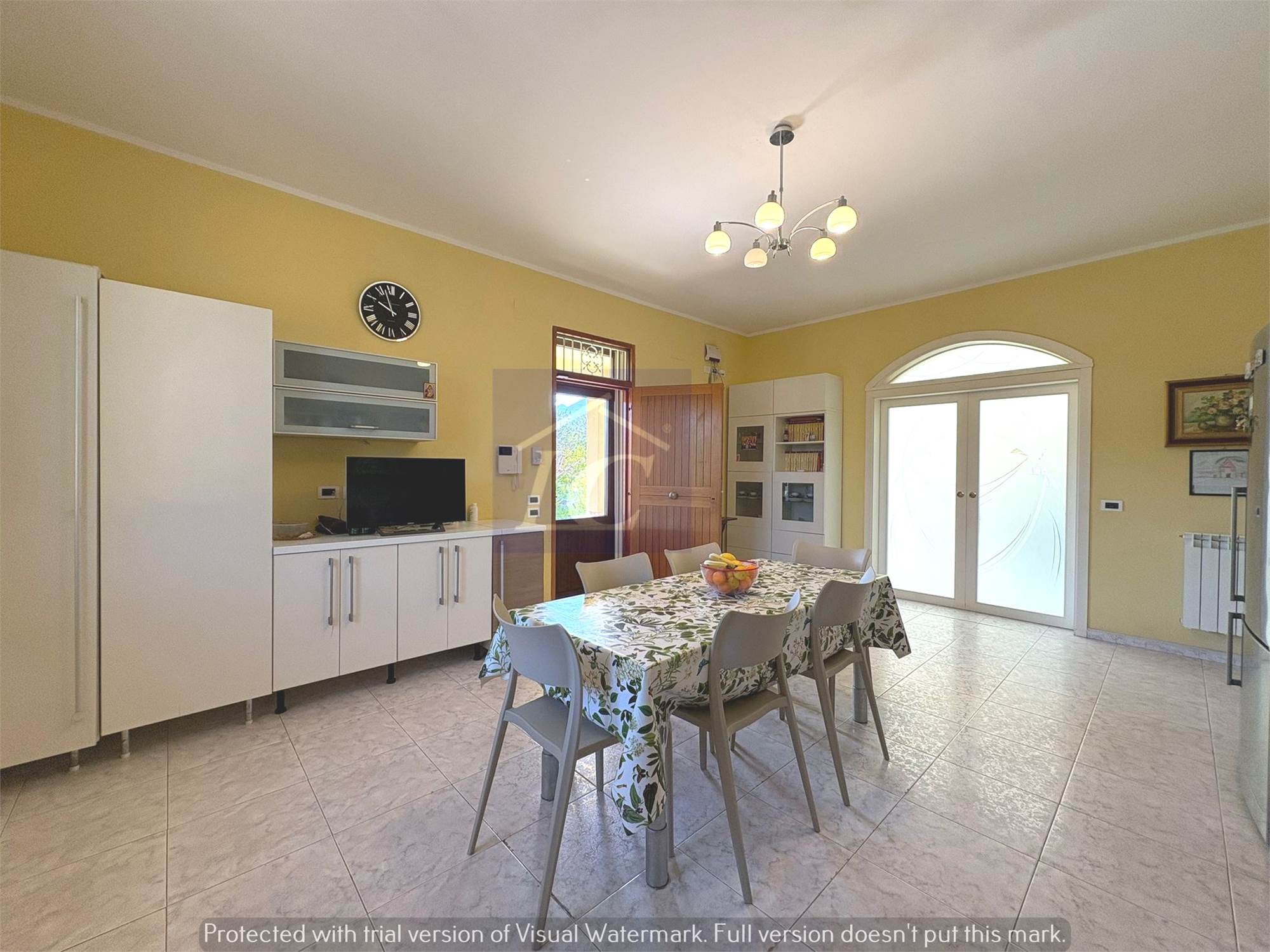 Ground floor: entrance from a masonry portico onto the kitchen-living room via a finished wooden and frosted glass door leads to a large hall of approximately 80 m2 with a 35 KW fireplace connected to the heating system that can function as a replacement for the boilers, laundry room, bathroom with shower cubicle, study.