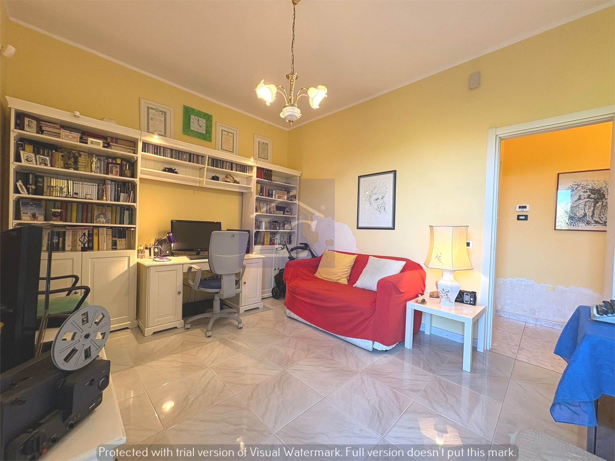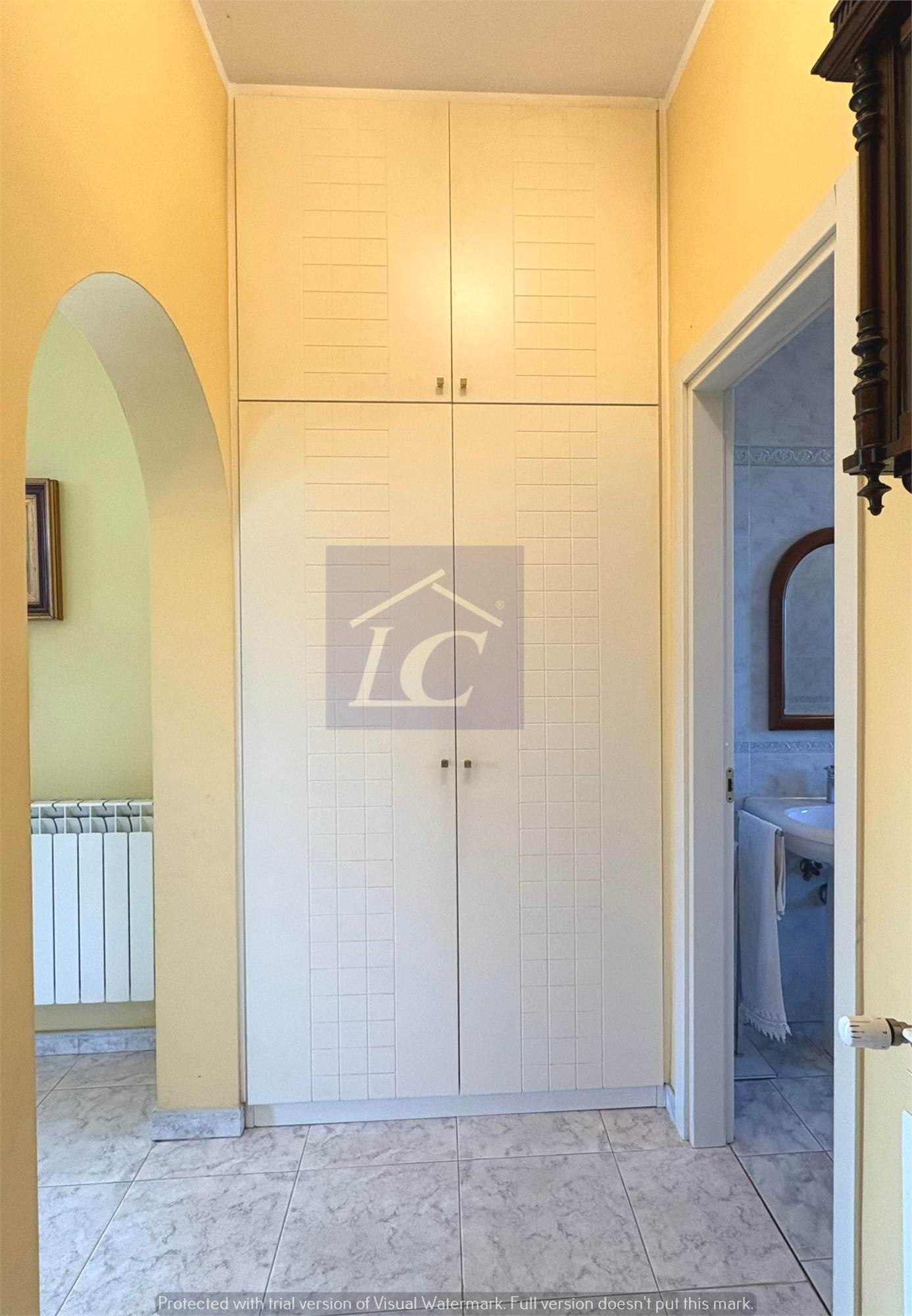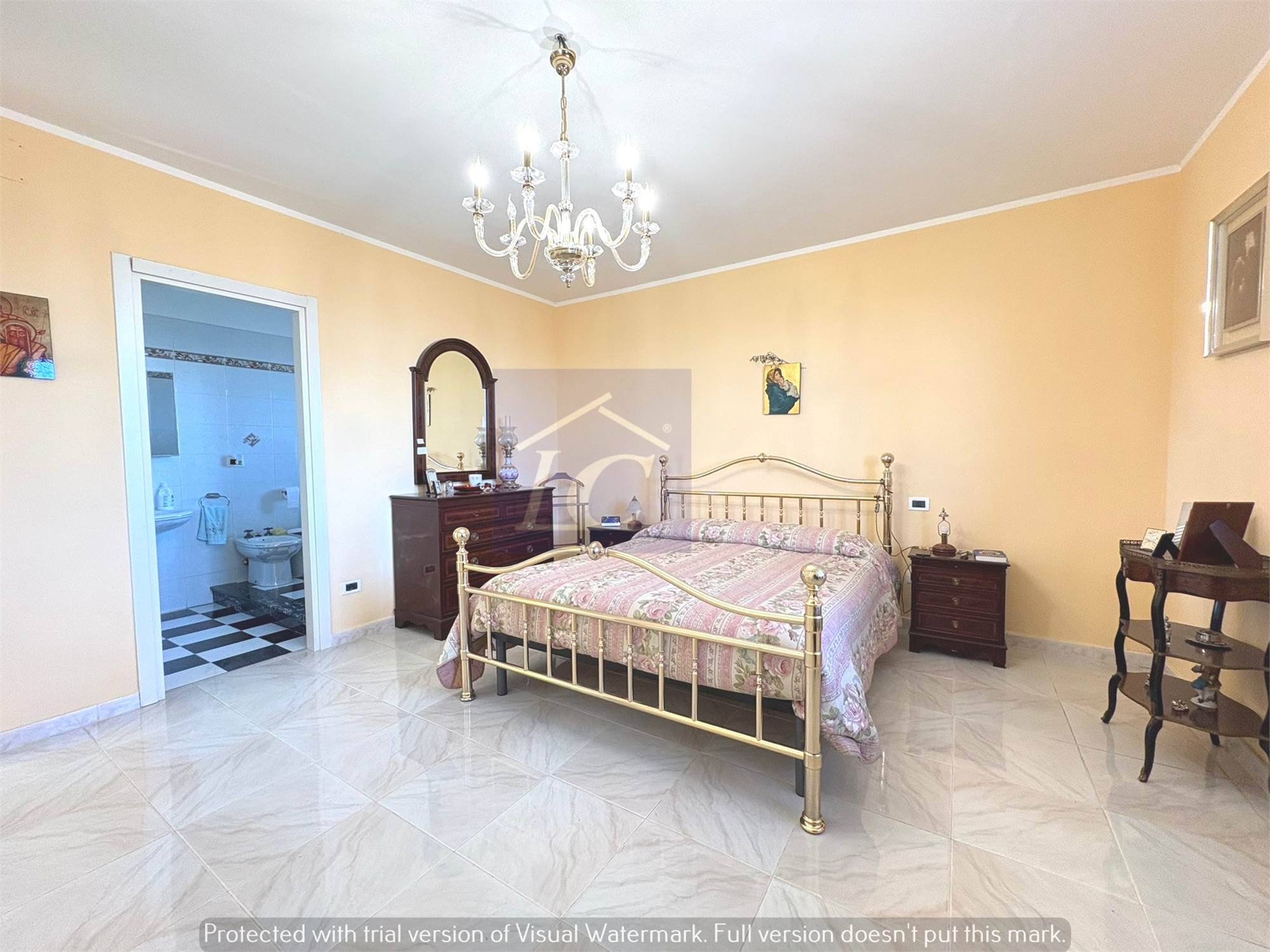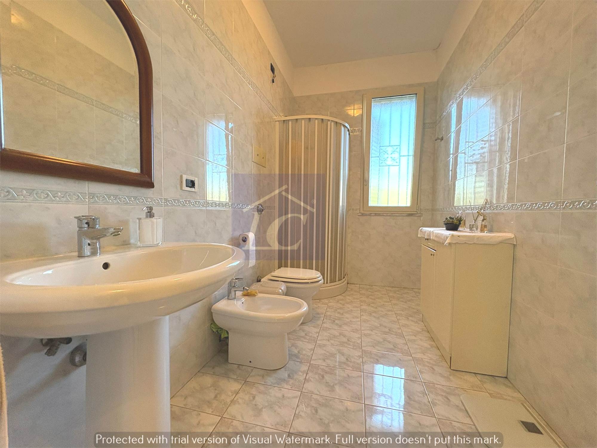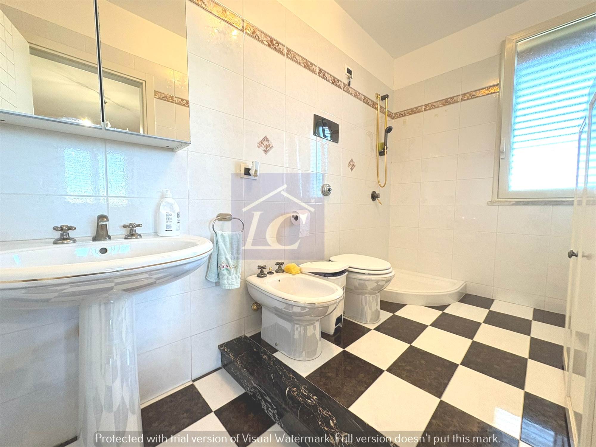 First Floor: entrance hall, kitchen with French window on terrace, bathroom with corner bathtub, three double bedrooms of one with bathroom with attached shower.