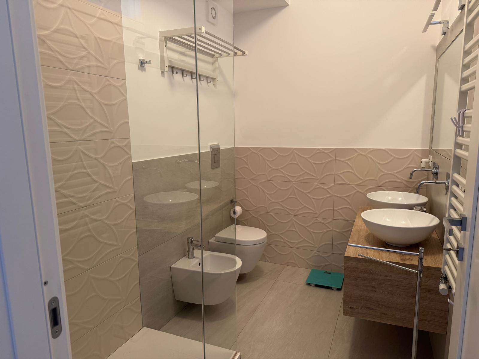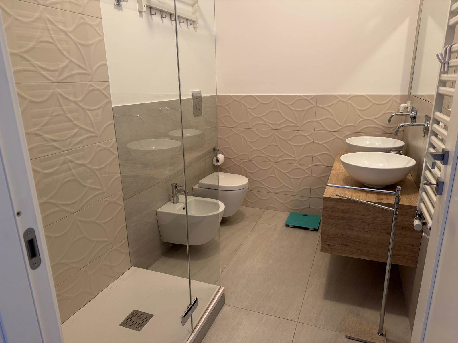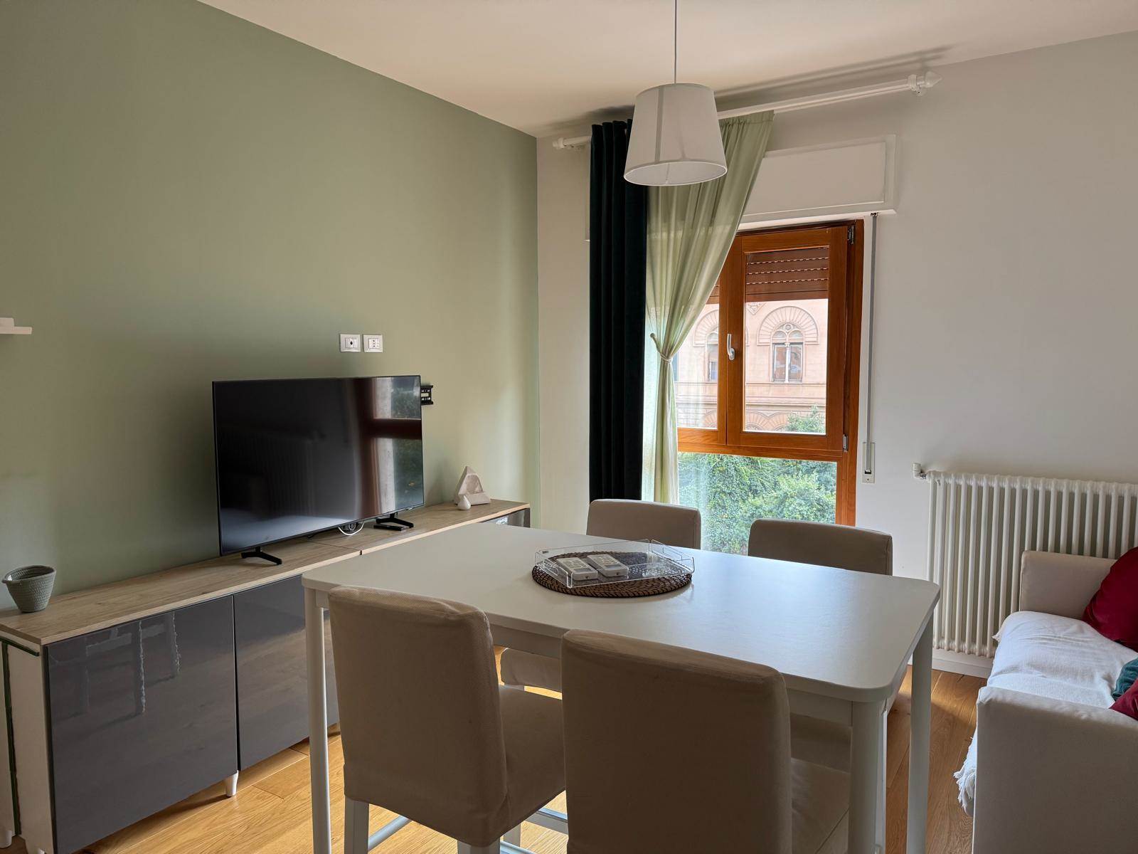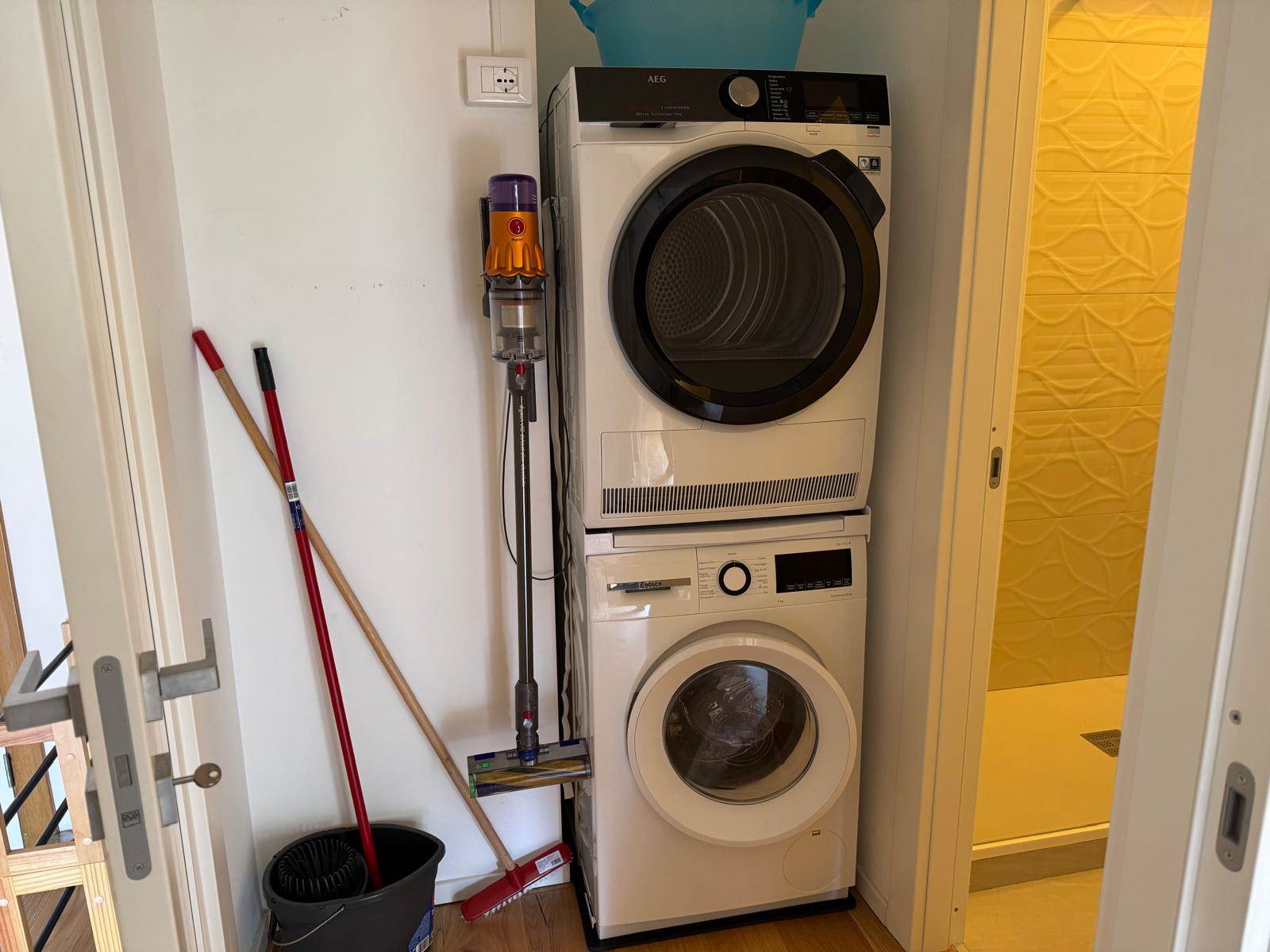 L'appartamento è così disposto: ingresso su cucina completa di elettrodomestici ( Lavastoviglie, Frigorifero con congelatore, Stoviglie e utensili da cucina già presenti) soggiorno arredato ( Divano letto matrimoniale nel salone, Smart TV Samsung 55”) Bagno moderno con doppio lavabo e doccia, lavatrice Bosch, asciugatrice AEG, aspirapolvere Dyson.
