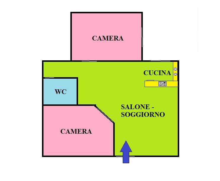 L’appartamento comprende due camere da letto, una grande cucina soggiorno, bagno e antibagno.