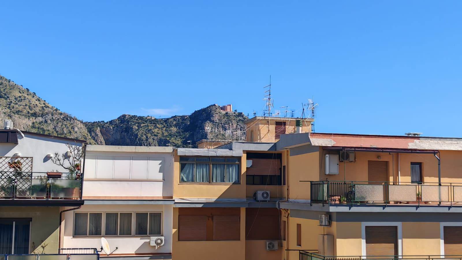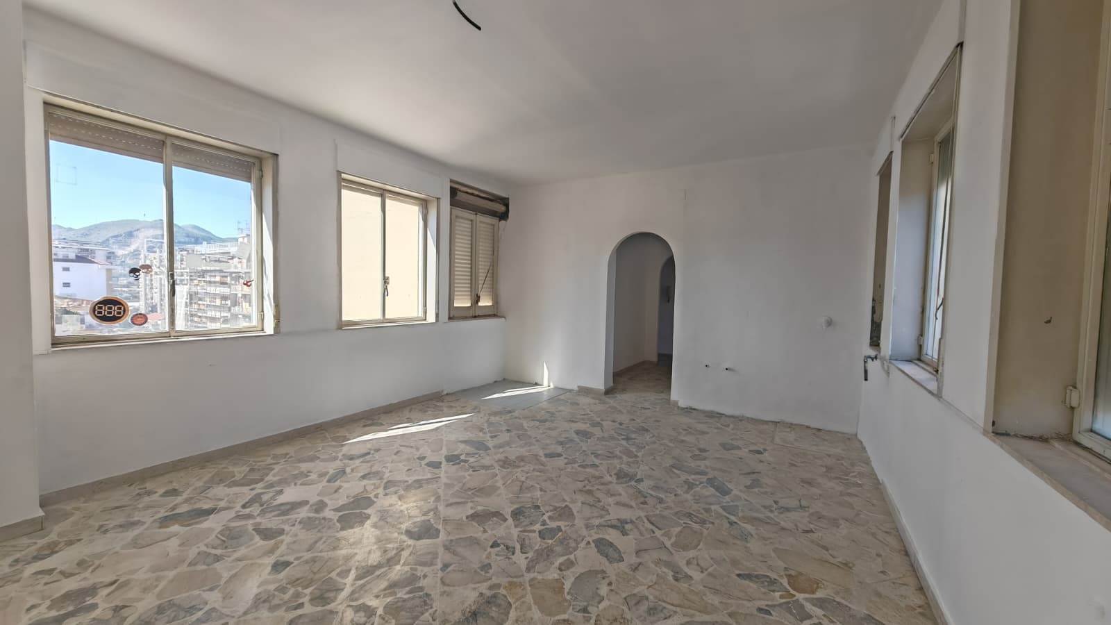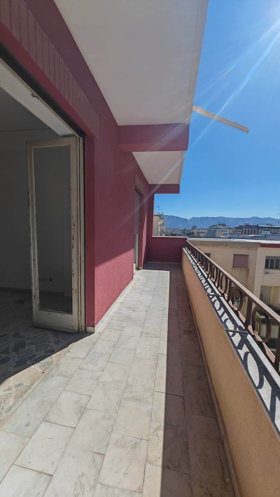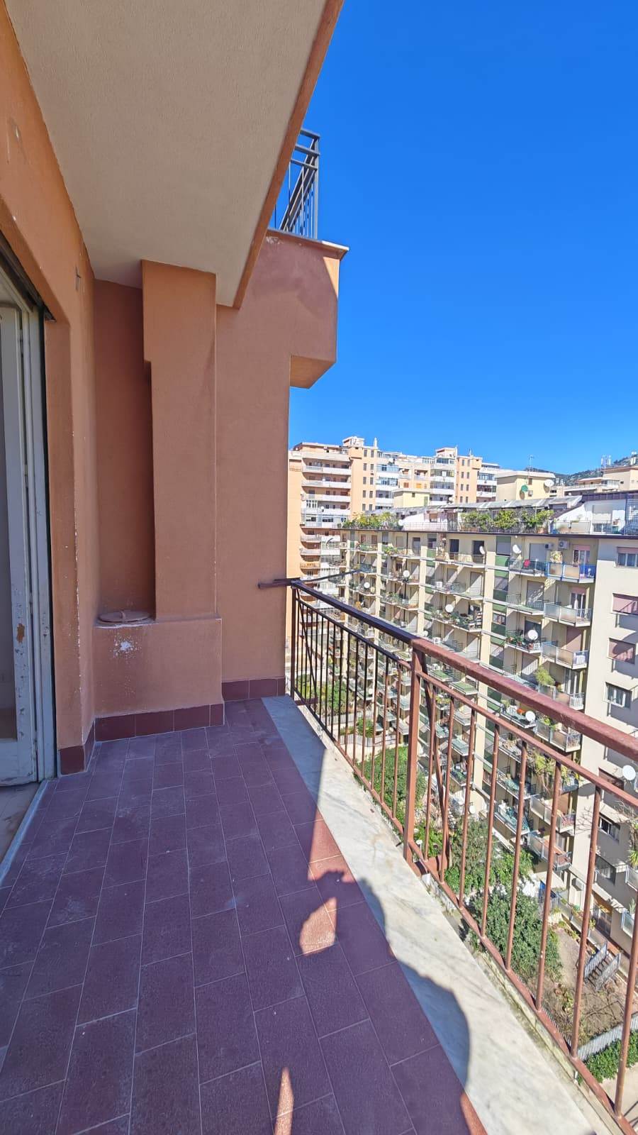 Ingresso ampio, salone, 2 camere da letto, cucina abitabile, bagno grande (precedentemente 2), grande camera su terrazza verandata (sanata) due grandi balconi vivibili e panoramici.