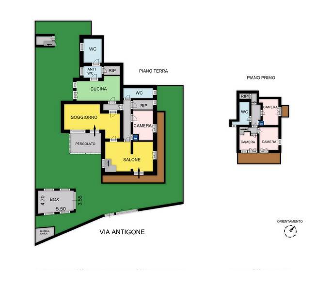 La prima di 227 mq distribuita su due livelli ha accesso da Via Antigone, ed è costituita al piano terra da doppio ingresso (uno su salone, l’ altro su soggiorno), cucina, camera , due bagni, due ripostigli (di cui uno finestrato); al primo piano sono presenti tre camere, bagno, ripostiglio e due balconi.