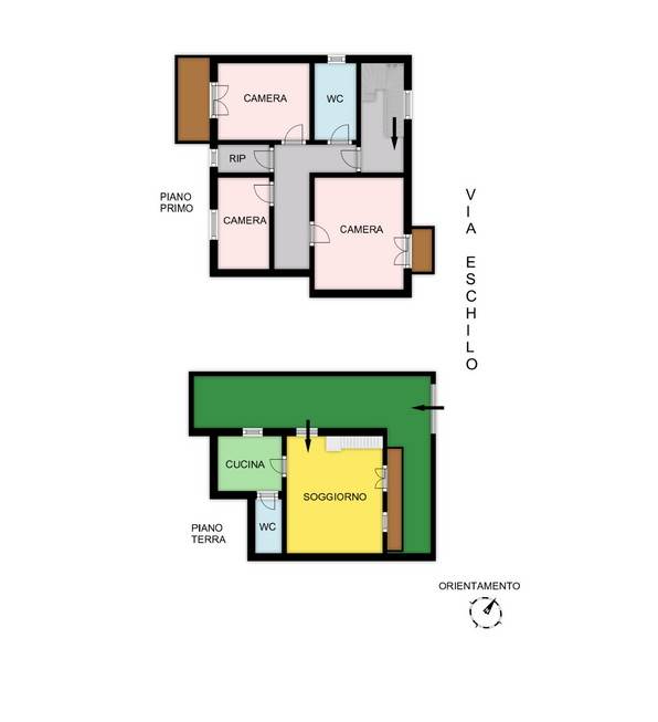 La seconda di 93 mq distribuita anch’ essa su due livelli, ha accesso da Via Eschilo, ed è costituita al piano terra da ingresso su soggiorno, cucina, bagno e spazio esterno; al primo piano sono presenti tre camere, bagno, ripostiglio e due balconi.
