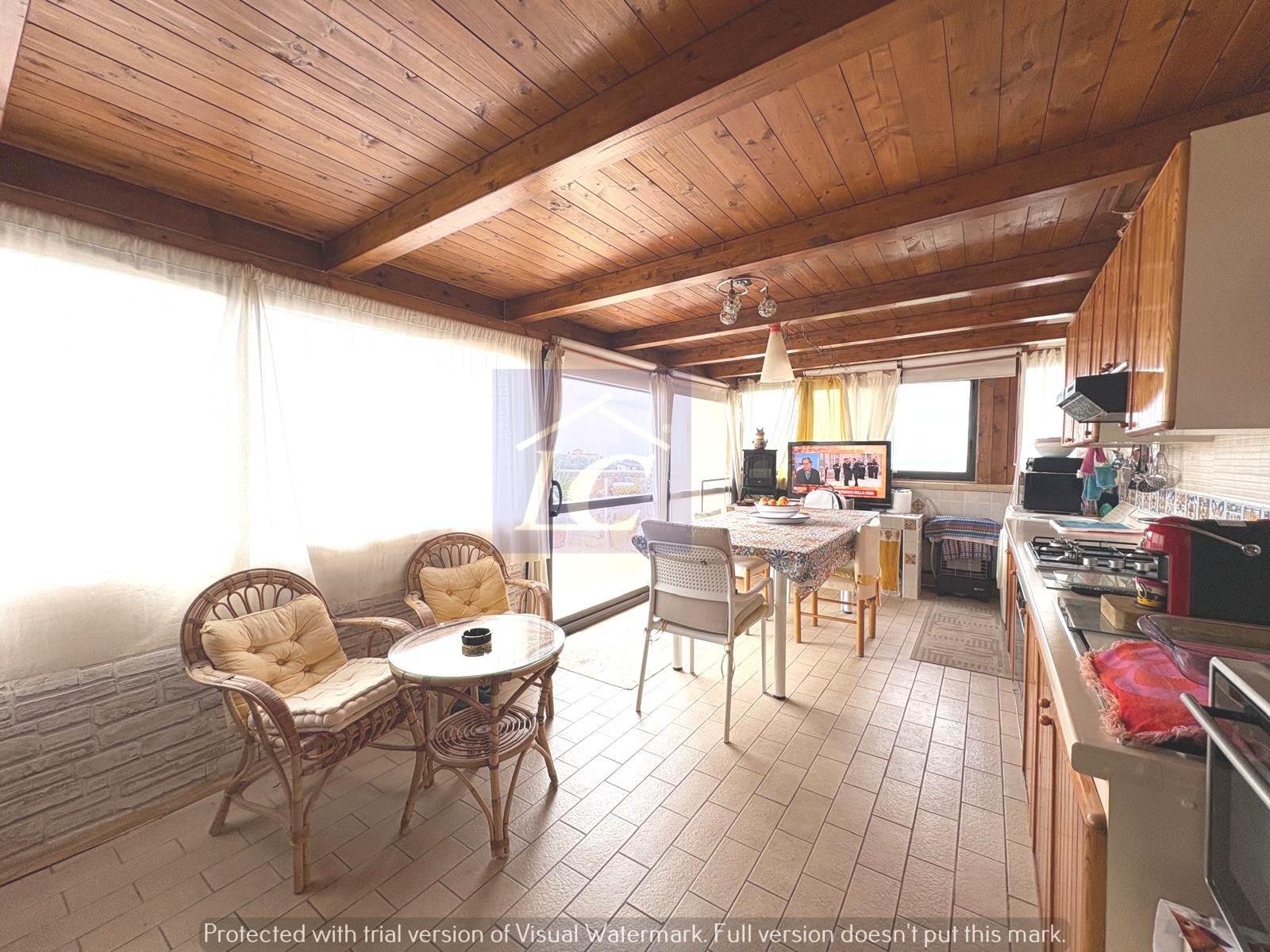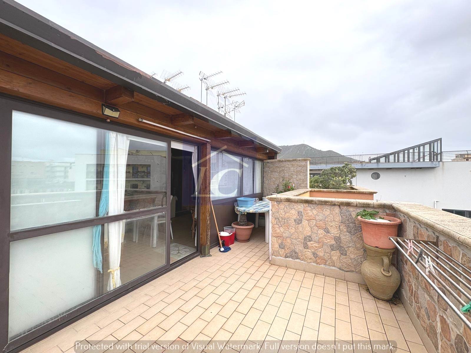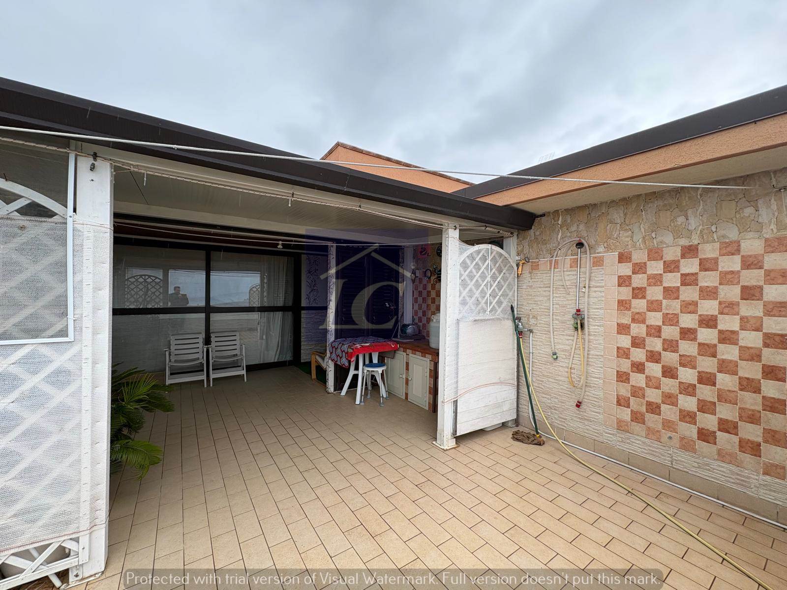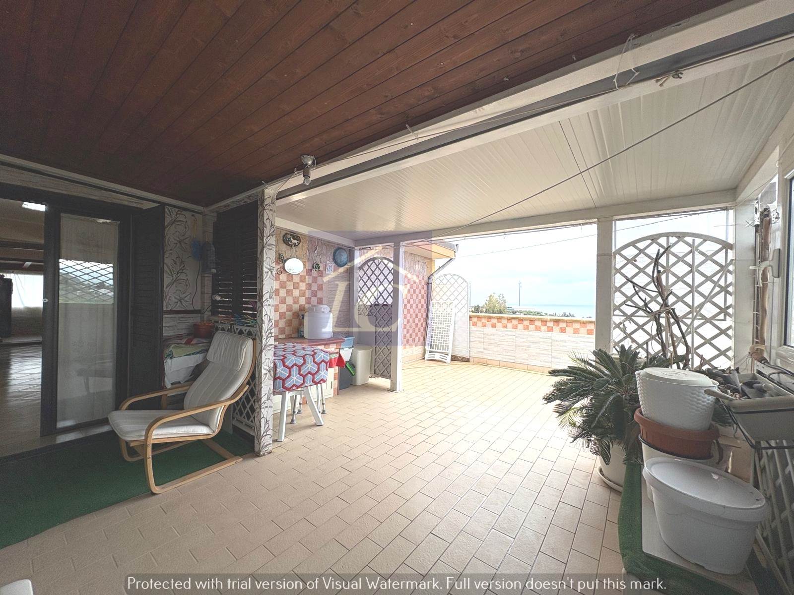 L'immobile è composto da ingresso su soggiorno con accesso al balcone (NORD) e ad una veranda con cucina abitabile che si affaccia su un terrazzo vista mare, due camere da letto matrimoniali di cui una con apertura su terrazza con area porticata vista mare, bagno con box doccia, ripostiglio.