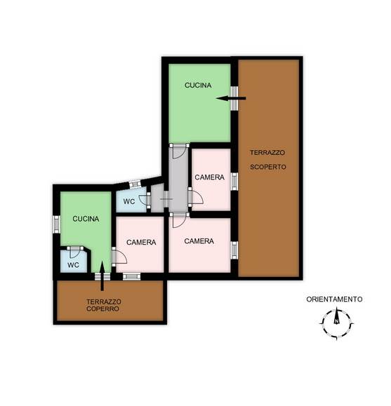 La prima di 88 mq (attualmente locata) è costituita da ingresso su cucina soggiorno, due camere, bagno e terrazzo scoperto; la seconda di 51 mq è costituita da ingresso su cucina, camera, bagno e terrazzo coperto.